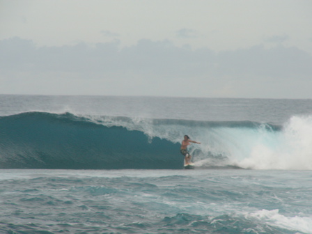 その間に摂取した食事は、朝のキャンプでのオムレツからスタートして、セスナではドーナッツ。 メダンではレストランでインドネシア料理フルコース。メダンからのフライトで機内食、ジャカルタではエアポートホテルでオックステールスープ。その後軽くナシチャンプルーなども食べ、最後のフライトで成田に向けて機上の人に。最後のスナックは味気ないマフィンとビンタン。最後に朝にオムレツブレックファーストですべての空飯終了。 成田からの帰路にラーメン屋に入り、久々にラーメンを食べ全てのミッション終了。 多分、この28時間で1万カロリーは軽く摂取したかも??? せっかくシメルー島にて消費したウエスト周りの脂肪もこれで、元に戻ったことでしょう。 またもや残念賞。 今日の写真はシメルーのサーフキャンプのガイドのデビット君。 こちらもあとわずかでメイクできた残念賞。
